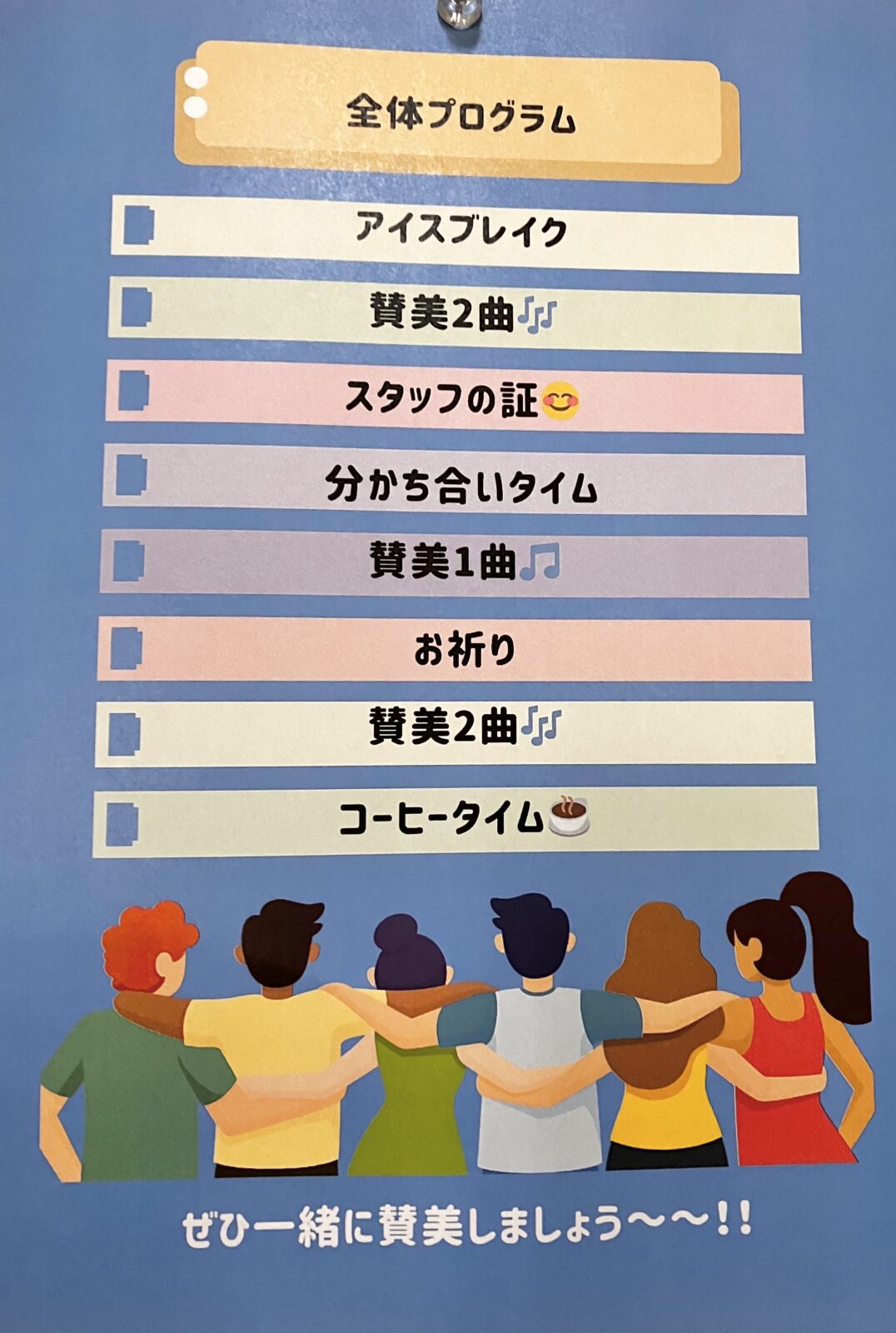 プログラム:アイスブレイク・うた・あかし・分かち合い・うた・おいのり・うた